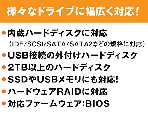 - 内蔵ハードディスクに対応: IDE/SCSI/SATA/SATA2などの規格に対応しています。 USB接続の外付けハードディスクに対応。2TBハードディスクに対応。SSDに対応。ハードウェアRAIDに対応。USBメモリにも対応。対応ファームウェア: BIOS