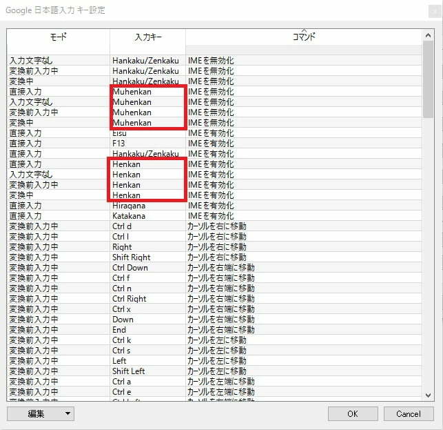 以下の画像のように、Henkanキー(変換キー)とMuhenkanキー(無変換)キーへIMEの無効/有効化を割り当てます。