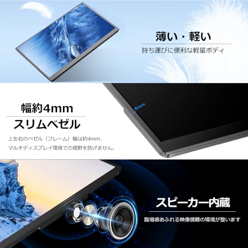 - 【超軽量!超薄型!超細いベゼル!】モニター本体重量はわずかの249g(カバー含めの重さは約393g)、文庫本で例えると1冊ぐらい!最薄部は僅かの5mm、スマホよりも薄い!携帯性に優れており、外出時は鞄に簡単に収納できます。上と左右のベゼルはわずかの4mm、周りとほぼ溶け込んでいる!下部のベゼルも10mmだけで、指一本よりもやや細い!折りたたみ可能な脱着式のマグネットカバーも付属されており、本体を傷から守る上、スタンドとして使うこともできます。底部に滑り止めゴムもあり、安定性の心配なく!