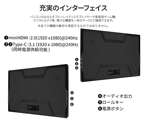- miniHDMI x1, USB Type-C x2を搭載し、パソコンだけでなく、スマートフォン、タブレット、ブルーレイディスクプレイヤー、家庭用ゲーム機などの接続が可能です。