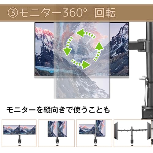 - 【2画面で作業スペースを拡大】片方の画面でネット検索、片方の画面で書類作成など、作業ごとにスペースを使い分けたい・操作に広い作業画面が欲しい方にデュアル型モニターアームお勧めいたします。それぞれのモニターの回転にも対応しており、片方の画面を縦画面、もう片方を横画面にするなど、幅広い環境を構築できます。