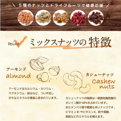 - ● 原材料名:アーモンド(アメリカ産) 、くるみ 、落花生、レーズン(レーズン 、食物油脂)、乾燥クランベリー(クランベリー 、砂糖、食物油脂) (アーモンドと落花生は焙煎。くるみは生。)