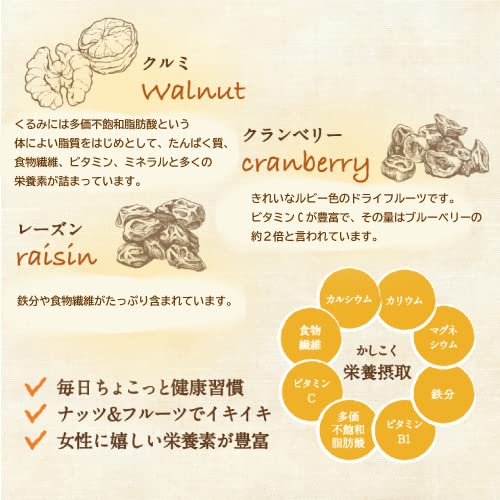 - ● 原材料名:アーモンド(アメリカ産)、くるみ、カシューナッツ、乾燥クランベリー(クランベリー、砂糖、植物油脂) (アーモンド、カシューナッツは焙煎、くるみは生。)