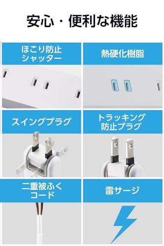 ・電源コードには一般社団法人日本配線システム工業会規格(JWDS0010)に適合した二重被ふくコードを採用しており、断線や被ふく破れによる感電・火災の防止に有効です。・狭い場所でも配線しやすい180°スイングプラグを採用しています。