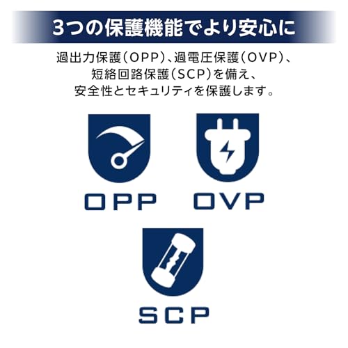 - 過電流保護(OCP)、過電圧保護(OVP)、過負荷保護(OLP)、短絡保護(SCP)等の各種安全回路を搭載
