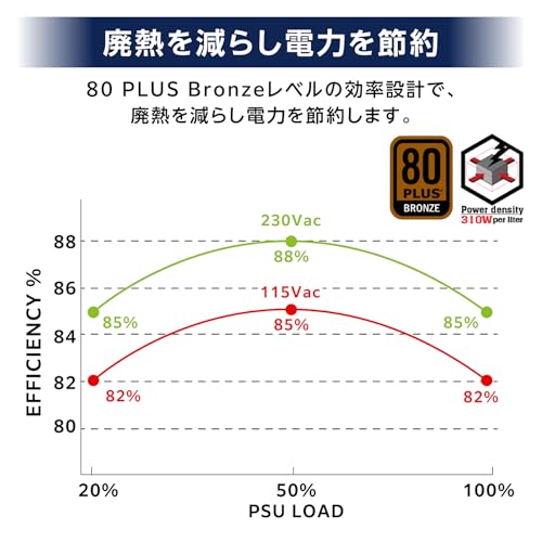 - 80 PLUS Bronzeレベルの効率 (効率82% ~ 85%、20% ~ 100%負荷時)