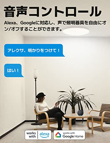 - 【音声で照明をコントロール】アレクサ、Googleアシスタント、Apple Siri、LINE CLOVA等と併用し、声で照明を操作可能。動きたくない時、「アレクサ、LEDシーリングライトをオンにして」という一声で照明が自動的にオンになります。音声でON・OFFのほか、明るさと色温度の調整もできます。IFTTTにも対応可能。