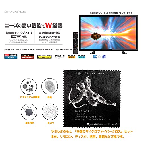 - ・付属品 取扱説明書、保証書、リモコン用単4乾電池×2、リモコン、買って観るまでガイド、mini B-cas カード、スタンド×2、取付用ねじ×4、やさしさのもと『幸運のマイクロファイバー』