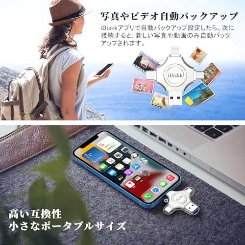 - 【写真の自動バックアップ・ワンクリックバックアップ】 フラッシュドライブ接続時に、ワンクリックで、IOSデバイス内の写真やビデオがバックアップ可能で、Appleデバイスのカメラロールを自動バックアップするようにiDiskkアプリで設定することができます。新しい写真・ビデオ・音楽・ドキュメントのみを自動的にバックアップされます。手動でバックアップする写真を選択する必要はありません。