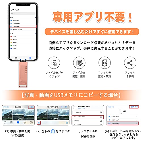 - 【完全アプリ不要の直感操作】対応USBメモリ256GBは完全アプリ不要設計。アルバムを開いて写真/動画を選択するだけ!3ステップ(選択→タップ→保存)でから直接usbに写真を移す可能。端子を挿すだけで外付けメモリ 自動認識、機械操作が苦手な方でも迷わず使えます。